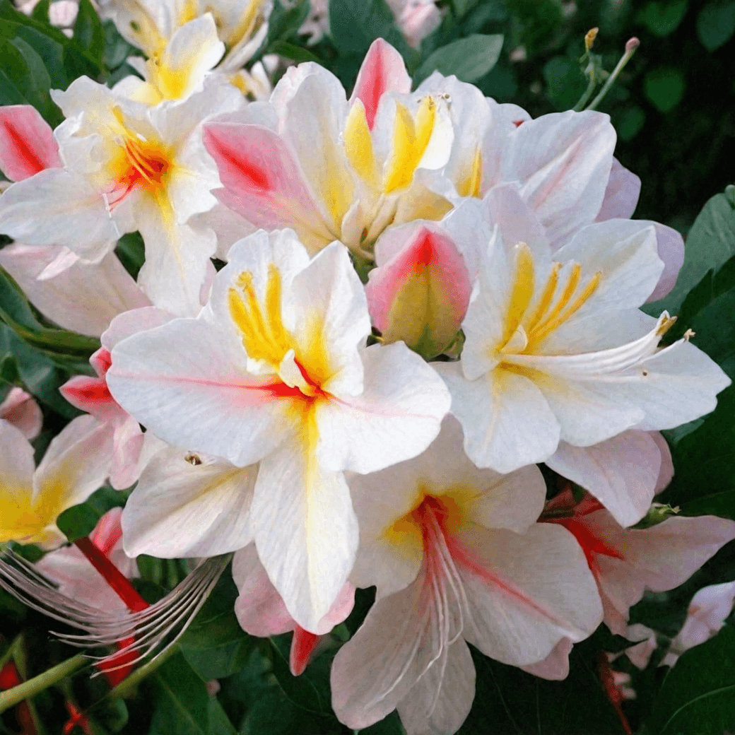 Žiedų charakteristika: Viršutiniame žiedlapyje yra geltonai oranžinė dėmė, o kuokelės — rausvos, kas suteikia žiedams įdomų vizualinį akcentą
