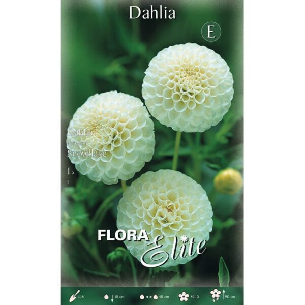 ‘Snowflake’ – subtili ir elegantiška jurginų veislė, pasižyminti pilnaviduriais, sniego baltumo žiedais. Švelnūs, dailiai išsidėstę žiedlapiai suteikia augalui lengvumo ir grakštumo, todėl jis puikiai tinka romantiškiems ir šviesiems gėlynams. ‘Snowflake’ žydi ilgai ir gausiai nuo vasaros vidurio iki pirmųjų šalnų, o tvirti stiebai leidžia sėkmingai naudoti šią veislę skynimui – žiedai vazoje išlieka dekoratyvūs ilgą laiką.