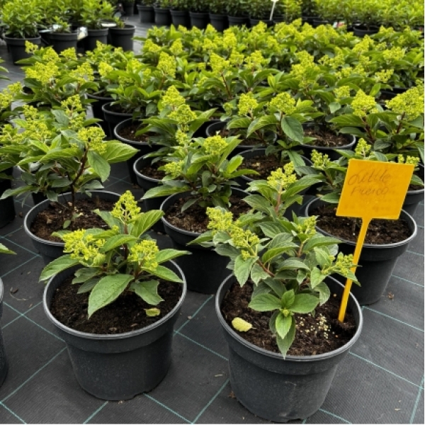 Šluotelinė hortenzija „Little Fresco“ – tai kompaktiška, sidabro medaliu apdovanota veislė, kuri idealiai tinka mažesnėms erdvėms, balkonams ar terasoms. Šis dekoratyvus krūmas pasižymi tvirtais, stačiais, bordo atspalvio stiebais, kurie išlaiko didelius, tankius žiedynus, todėl augalas neišgula net po stipraus lietaus. Žydėjimo pradžioje žiedai džiugina kreminiu baltumu su švelniu žalsvu potepiu, o vasarai bėgant jie palaipsniui nusidažo romantiškais rausvais atspalviais. „Little Fresco“ yra itin atspari šalčiui ir nereikli priežiūrai, todėl puikiai tinka tiek pradedantiesiems sodininkams, tiek kaip elegantiškas akcentas gėlynuose ar vazonuose.
