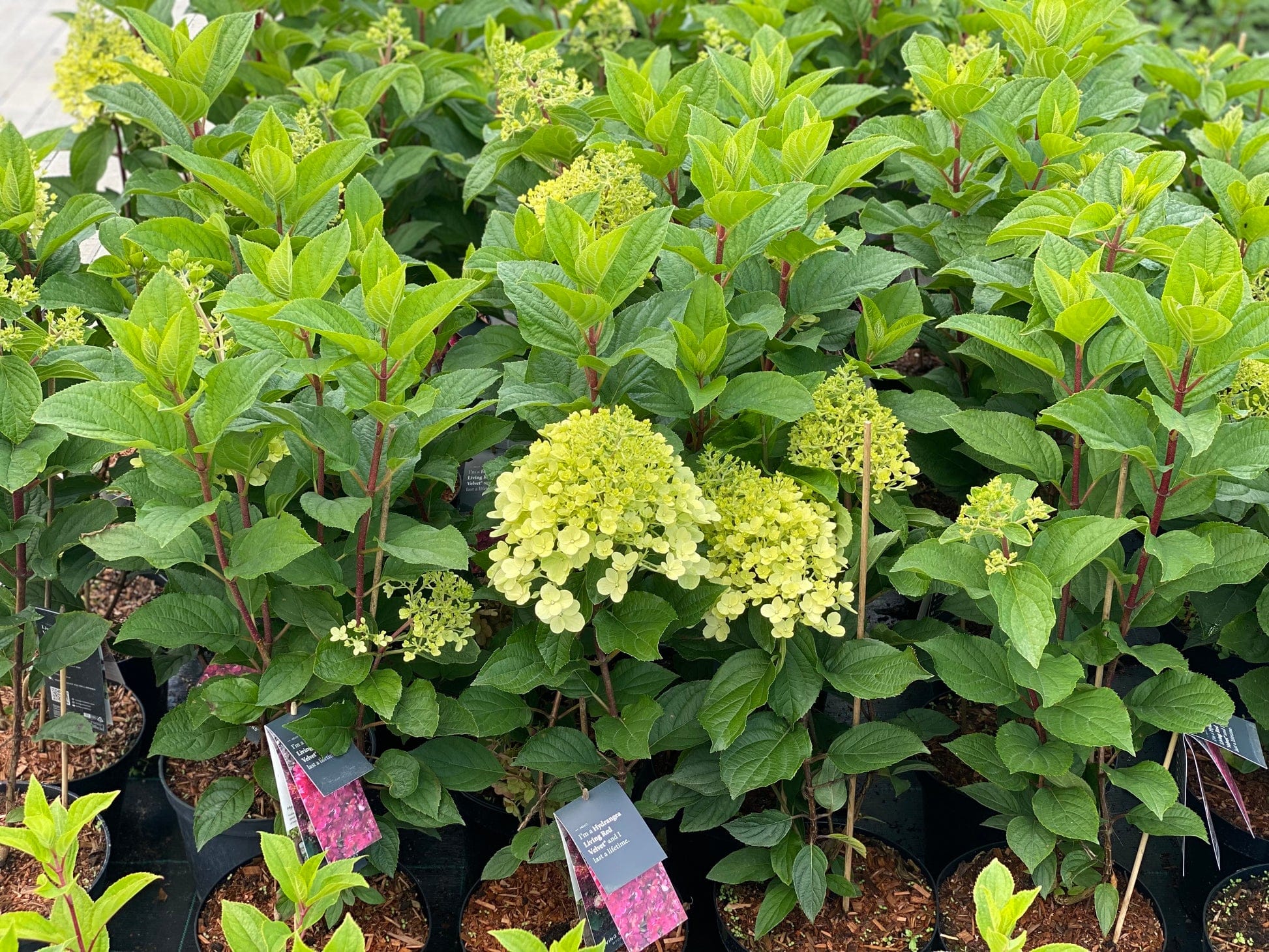 Šluotelinė hortenzija „Living Red Velvet®“ – tai išskirtinė, kompaktiška „Living Creations“ serijos veislė, vertinama dėl savo ilgo ir spalvingo žydėjimo, trunkančio net iki 100 dienų. Šis krūmas pasižymi tvirtais stiebais ir užauga iki 1 metro aukščio, todėl puikiai tinka ne tik gėlynams, bet ir auginimui dideliuose vazonuose terasose ar balkonuose. Pagrindinis augalo grožis atsiskleidžia žiedynuose: vasaros pradžioje jie būna švelniai žalsvi ir balti, o sezono eigoje palaipsniui tamsėja, kol rudenį įgauna intensyvų, aksominį rožinį bei rubino raudonumo atspalvį. Augalas yra itin atsparus šalčiui (iki -30 °C) ir nereiklus priežiūrai, todėl džiugins savo dekoratyvumu daugelį metų.