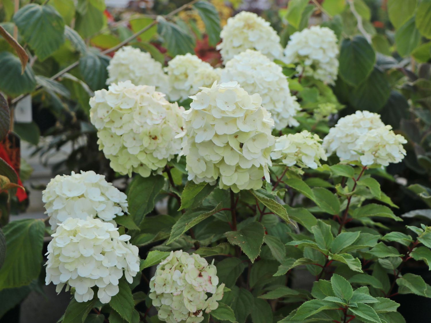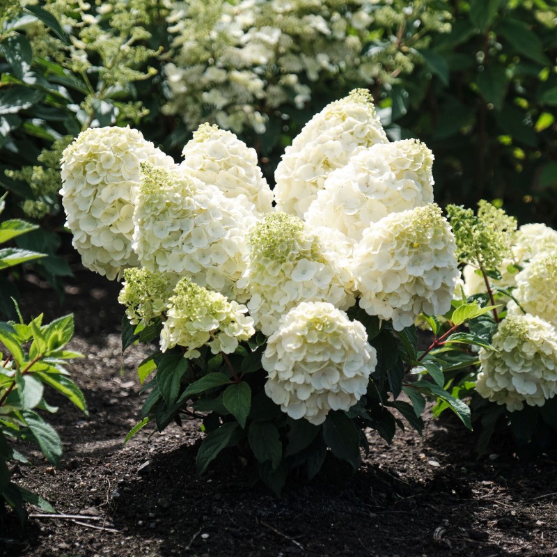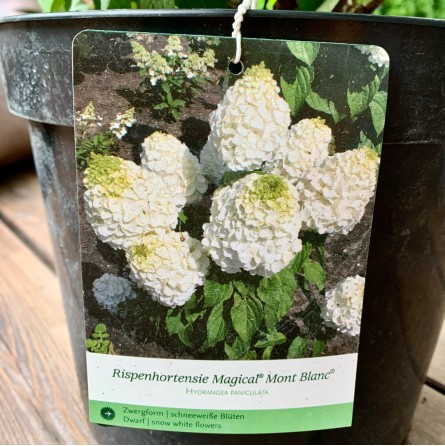 Šluotelinė hortenzija ‘Magical Mont Blanc’ – tai viena iš elegantiškiausių ir kompaktiškiausių veislių, vertinama dėl savo išskirtinio žiedynų grožio ir tvarkingos formos. Krūmas pasižymi tvirtais, stačiais stiebais, kurie puikiai išlaiko didelius, sniego baltumo žiedynus, todėl augalas neišgula net po stipraus lietaus ar vėjo. Žydėjimo pradžioje žiedai būna švelniai žalsvi, vėliau tampa ryškiai balti, o vasaros pabaigoje gali pasipuošti subtiliu rožiniu atspalviu, sukurdami dinamišką spalvų žaismą. Tamsiai žali lapai sukuria nuostabų kontrastą šviesiems žiedams, suteikdami sodui prabangos ir gaivos pojūtį. Ši veislė yra itin atspari šalčiui ir puikiai tinka auginti tiek pavieniui, tiek grupėmis, taip pat dekoratyviuose vazonuose terasose ar balkonuose.