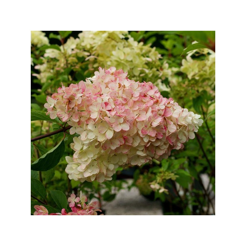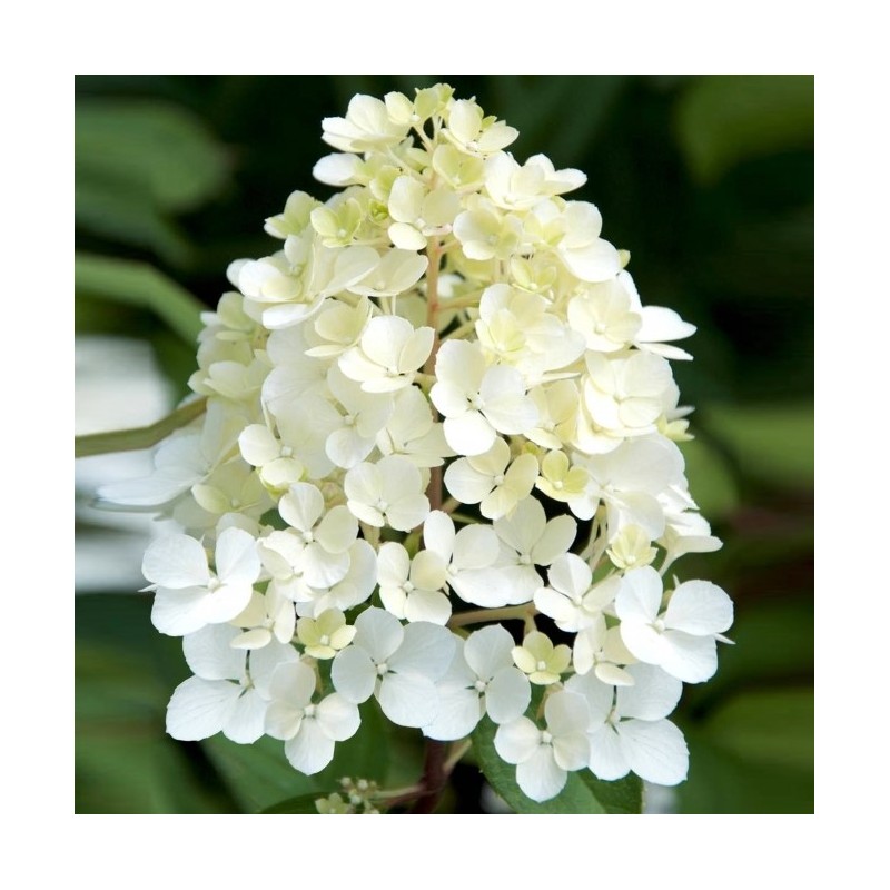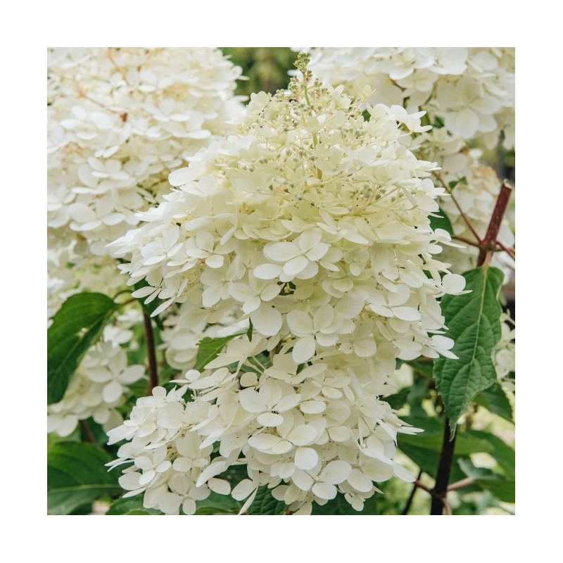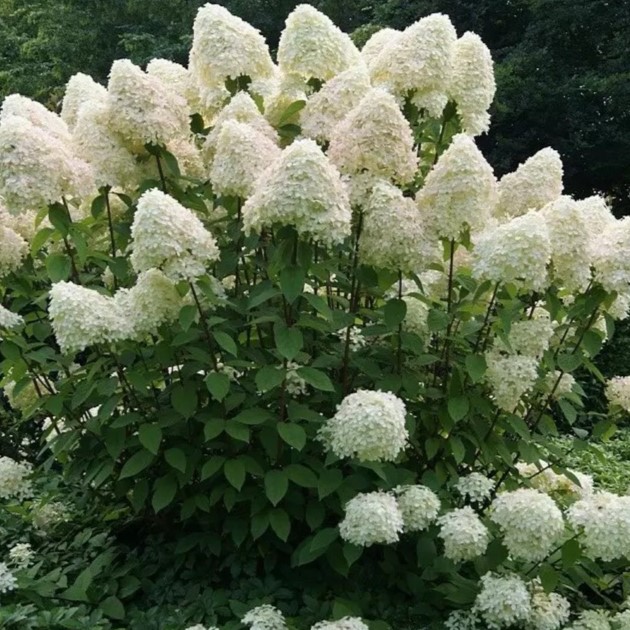 Šluotelinė hortenzija ‘Phantom’ – tai įspūdingo grožio, greitai augantis dekoratyvinis krūmas, vertinamas dėl savo milžiniškų žiedynų ir tvirtos struktūros. Augalas pasižymi itin dideliais (iki 40 cm), tankiais kūgio formos žiedynais, kurie žydėjimo pradžioje būna kreminės baltos spalvos, o vasaros pabaigoje ir rudenį nusidažo švelniais rožiniais atspalviais. Dėl stiprių, stačių stiebų krūmas puikiai išlaiko formą ir neišgula net po stipraus lietaus, todėl atrodo tvarkingai visą sezoną. ‘Phantom’ yra viena atspariausių šalčiui hortenzijų veislių (iki -34°C), taip pat puikiai toleruoja miesto orą bei genėjimą. Tai idealus pasirinkimas sodinti pavieniui kaip sodo akcentą, derinti su kitais augalais ar formuoti įspūdingas, gausiai žydinčias gyvatvores.